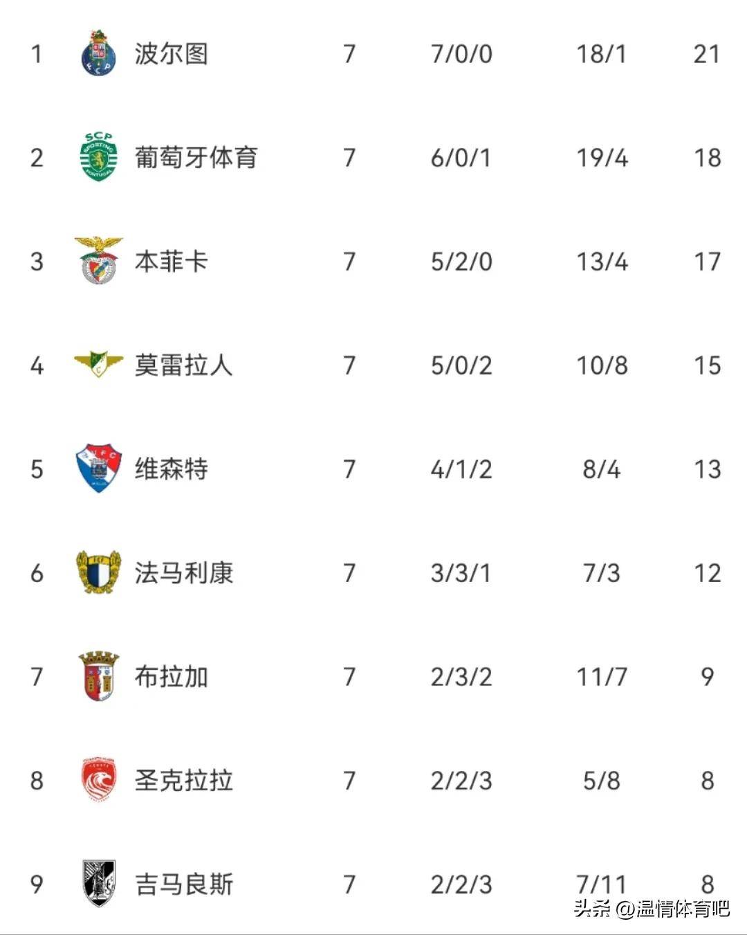 七轮过后,波尔图6战全胜积18分领跑;葡萄牙体育积16分紧随其后;穆里尼奥的本菲卡则落后4分排名第三。值得注意的是,葡萄牙体育唯一输球正是败给波尔图。