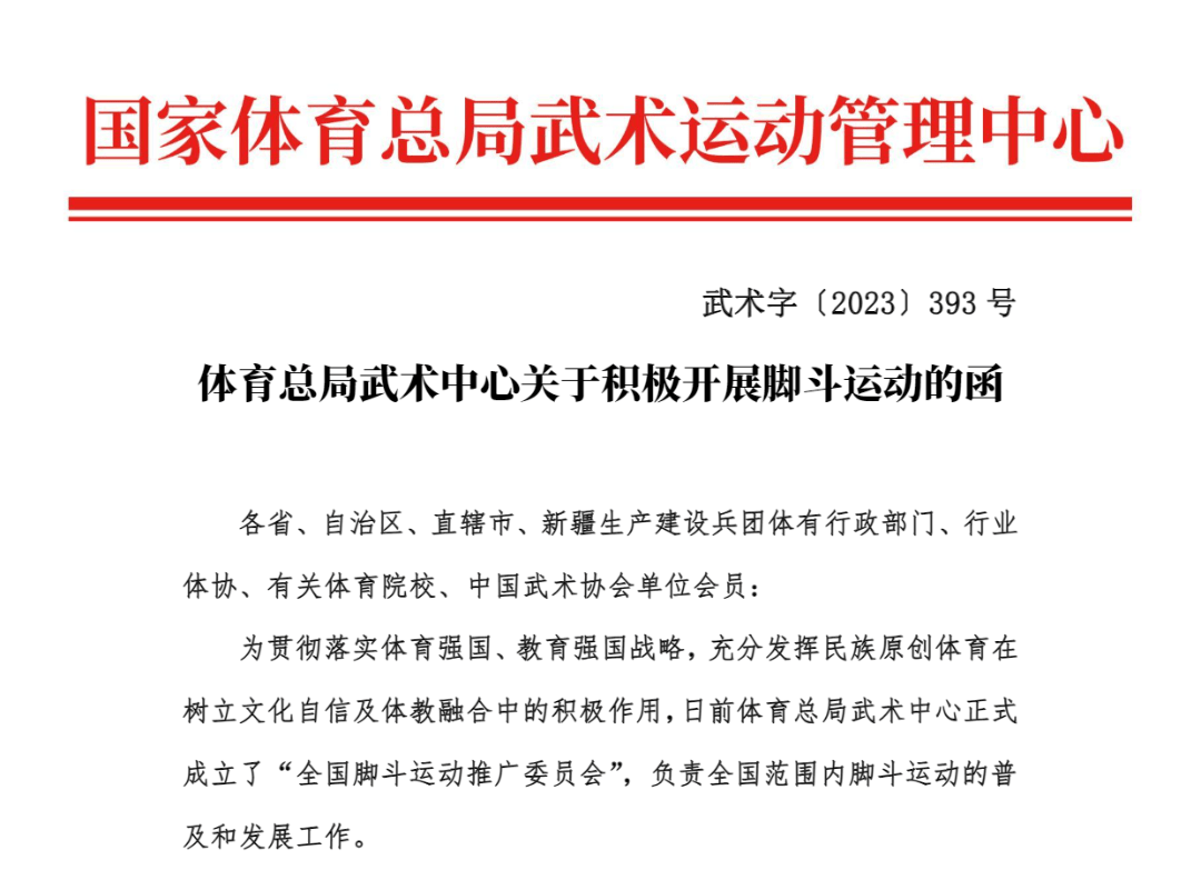 脚斗运动源于中国武术,是中华武术的重要分支。2023年,国家体育总局武术运动管理中心成立全国脚斗运动推广委员会,并在文件中明确要求“积极开展脚斗运动”,标志着这项民族原创体育正式纳入国家级推广体系。