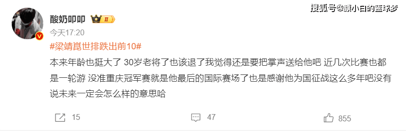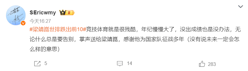 大V:竞技体育很残酷的,梁靖崑年纪慢慢变大,没出成绩没办法,无论什么都要告别,我们把掌声送给梁靖崑。
