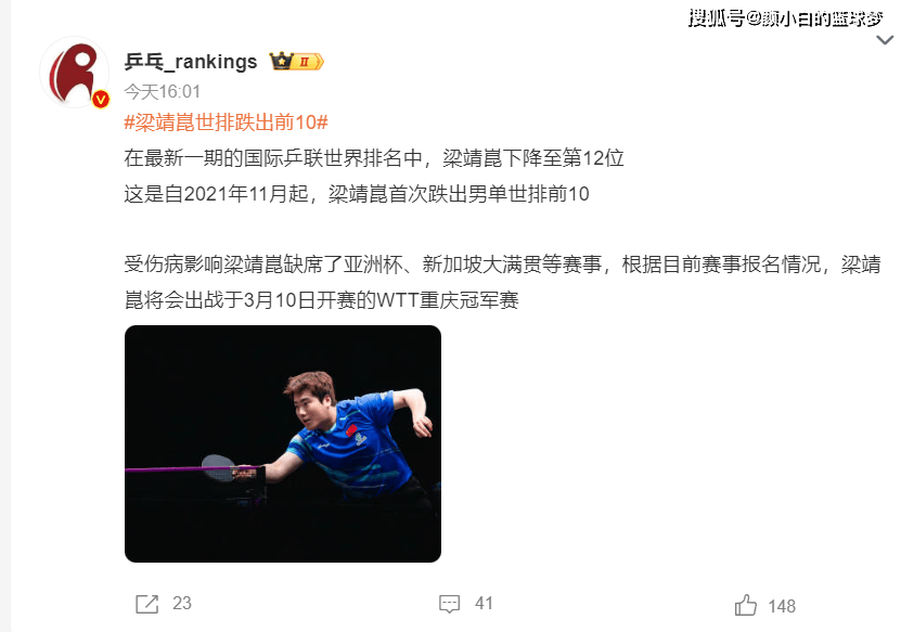 根据乒乓Rankings的报道,梁靖崑下降到世界排名12位,这是自2021年11月(11月15日)以来,梁靖崑首次跌出男单世界前十,也就是1560天。