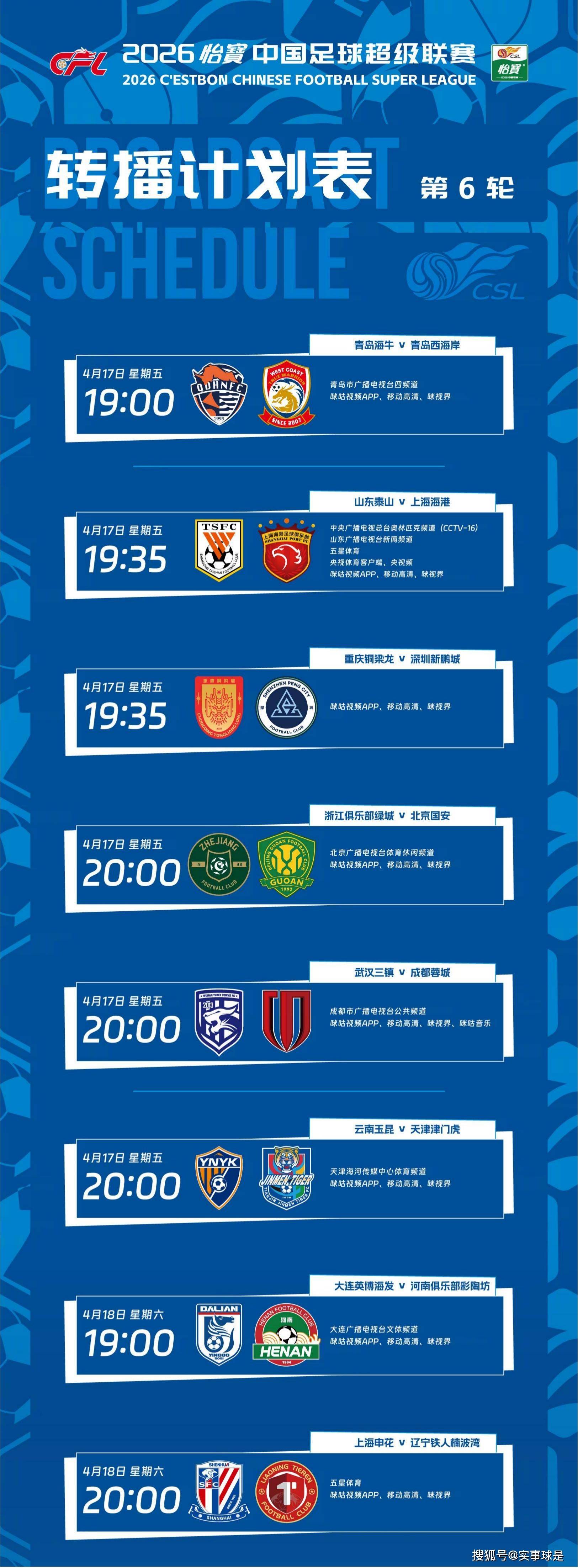2026-04-18体育,足球,波胆,反波胆,角球,串关,大小球,世界杯,欧洲杯,比分,足球比分,赛事,足球赛事,电竞赛事,体育赛事直播,足球直播平台,世界杯直播,足球直播,体育直播,NBA直播,游戏直播,LOL直播4月17日、18日,2026赛季中超联赛将展开第6轮角逐。赛前,中超官方发布了本轮转播计划表。根据转播计划,本轮8场比赛都有网络直播,7场比赛还有电视平台直播。