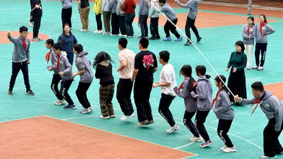 赛场边,加油声、呐喊声、欢呼声此起彼伏,回荡在整个校园。未参赛的同学化身最热情的啦啦队,为队员们鼓劲助威;班主任老师们也亲自上阵加入到自己的班级中,挥舞双手为队员们加油打气,眼神里满是期待与鼓励。师生同频共振,班主任们用行动传递着对班级的热爱,也用热情点燃着每一位同学的拼搏热情,让原本紧张的赛场充满了温暖的归属感。两小时的大课间时光,没有枯燥的等待,只有满满的运动热情,每一位同学都全身心投入,在跳跃中释放青春活力,在陪伴中感受集体温暖。