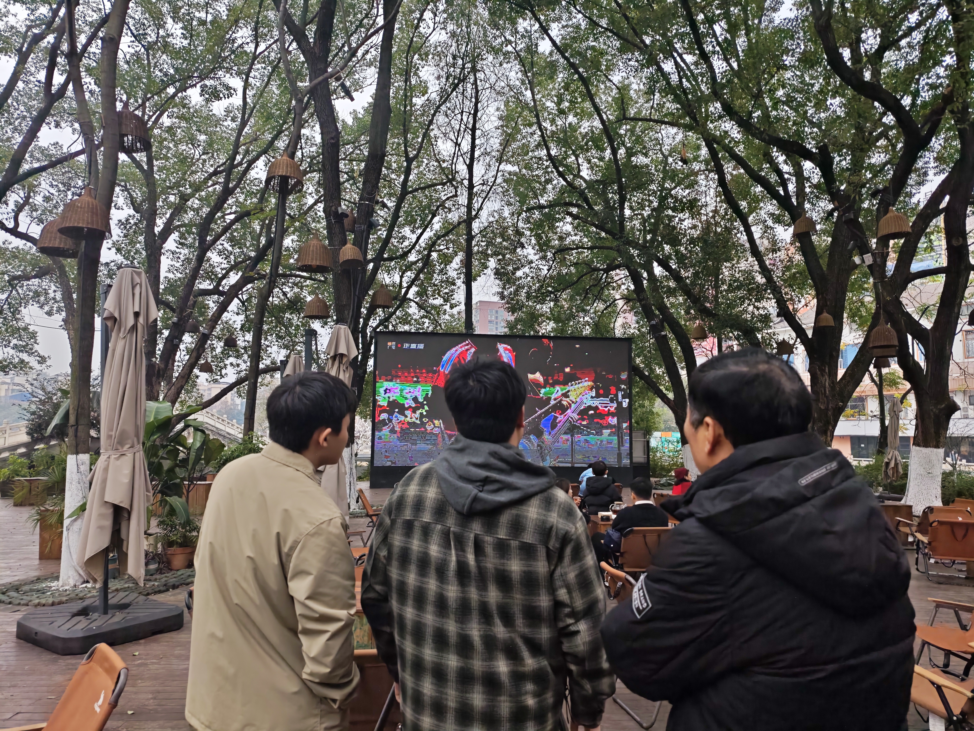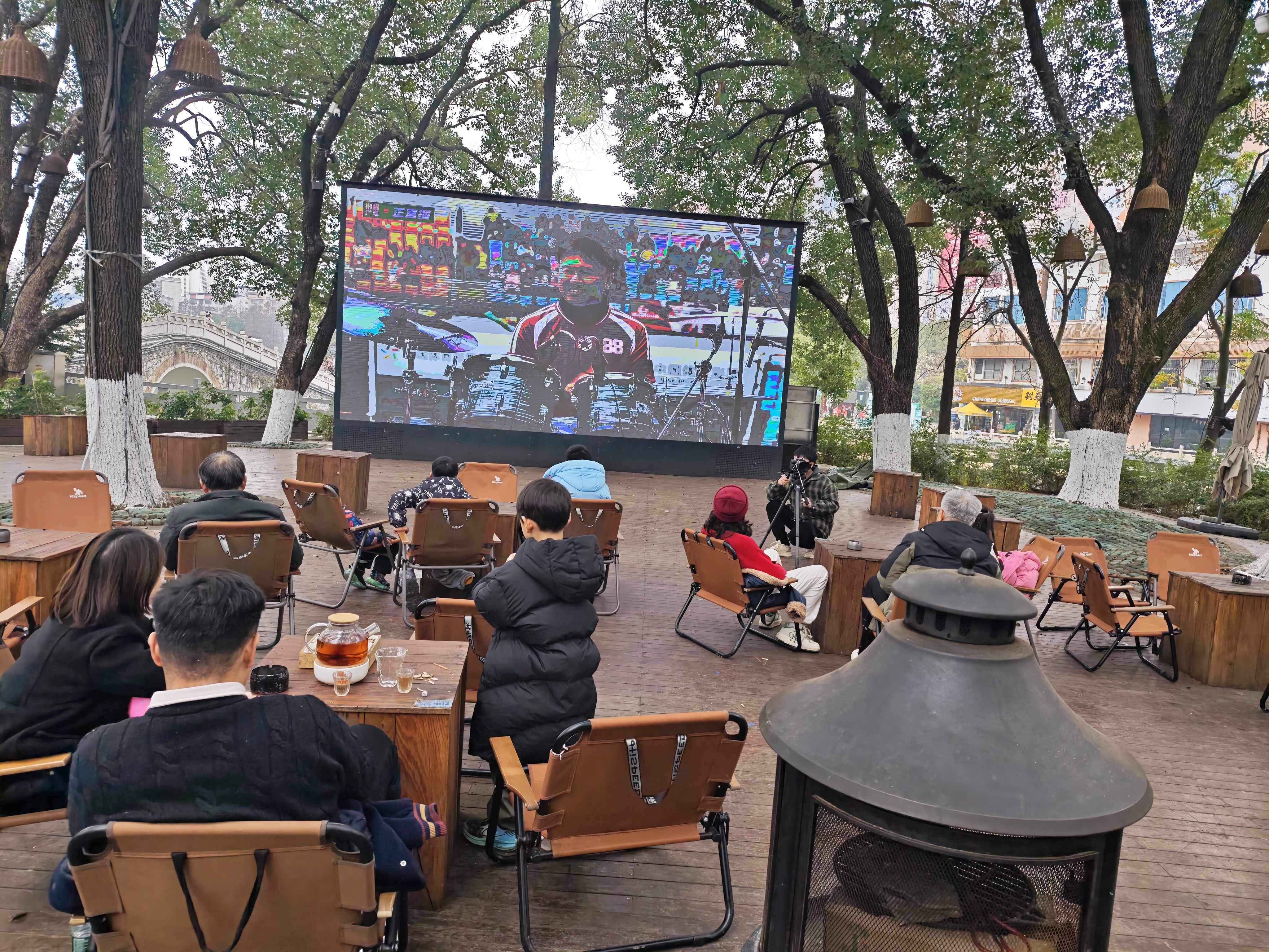 与此同时,北湖水月洲的“第二现场”更是热闹。宜人的天气让这里成为市民休闲的首选,转播大屏前人头攒动。大家三五成群围坐畅谈,围炉煮茶的袅袅香气与此起彼伏的助威声缠绕交织,构成了一幅鲜活的“美食+娱乐+社交”城市图景。路过的市民被现场氛围深深感染,纷纷停下脚步加入观赛人群。“本来是等老伴的,没想到遇上这么精彩的球赛直播和音乐表演,周末带孩子来凑个热闹太合适了。虽然我不懂足球,但看到球员们奔跑射门的瞬间,也忍不住在心里为他们呐喊!”牵着孩子的赵先生笑着说。趁着晴好天气前来采风的向先生也赞不绝口:“在公园能遇上这样的活动太惊喜了,看球赛、听摇滚,郴州的周末生活太惬意了!”